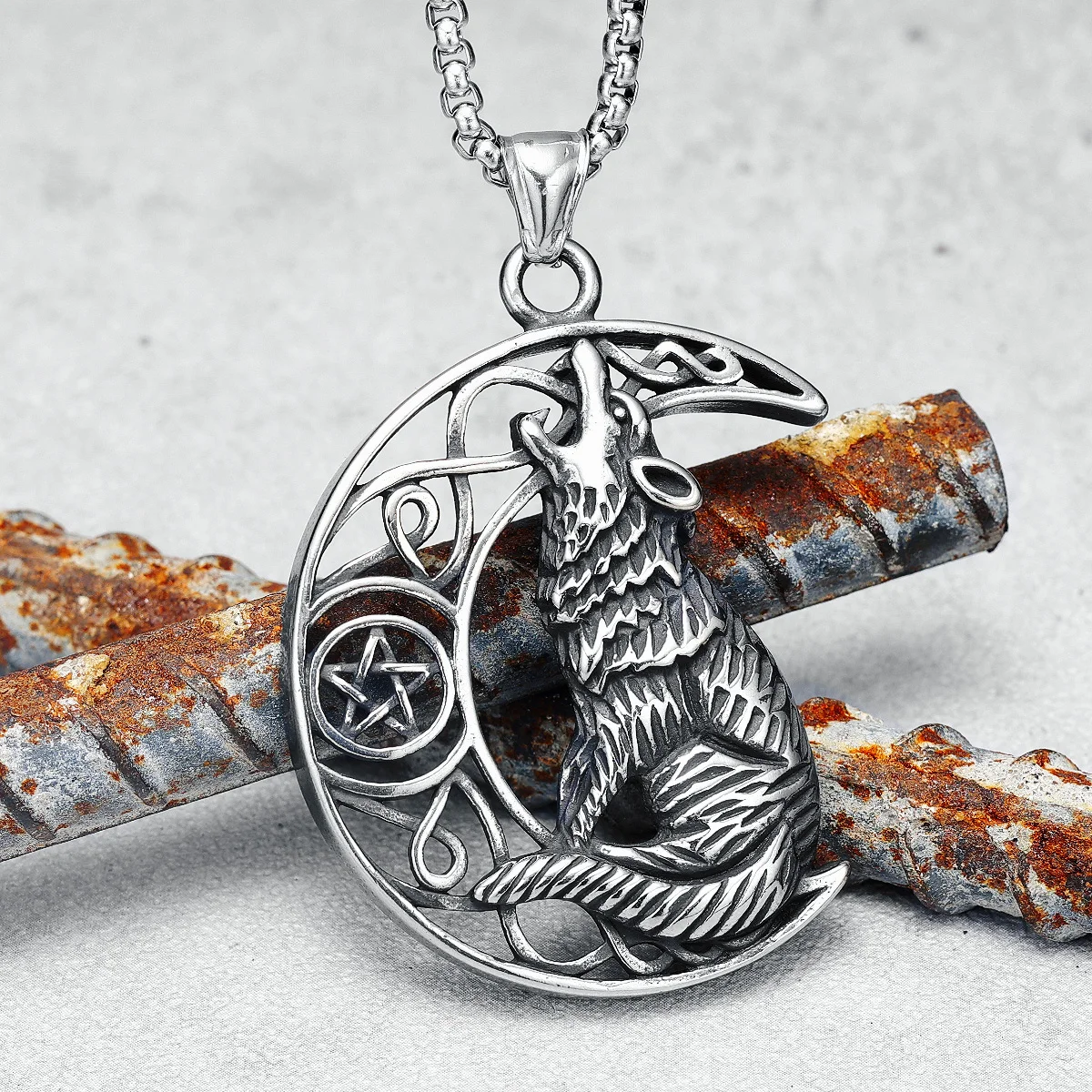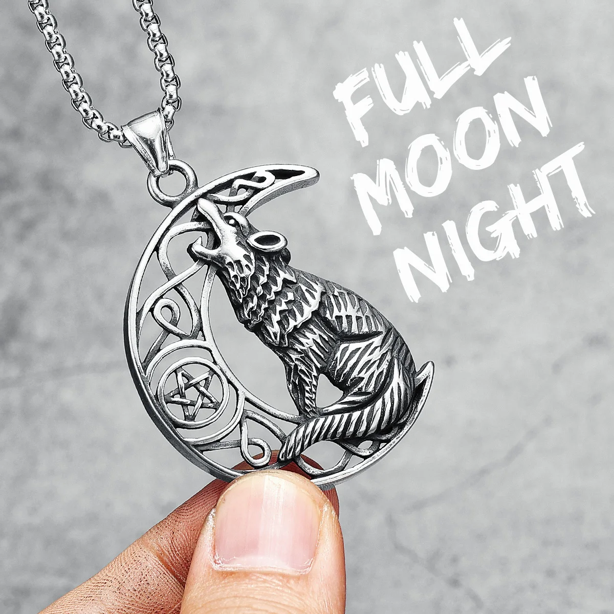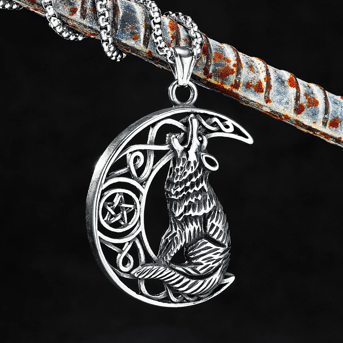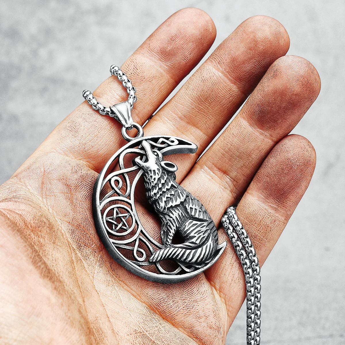 Viking Wolf Moon Necklace for Men or Women Retro Celtic Punk Hip Hop Pendant