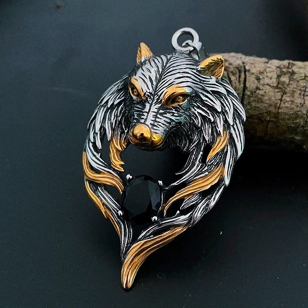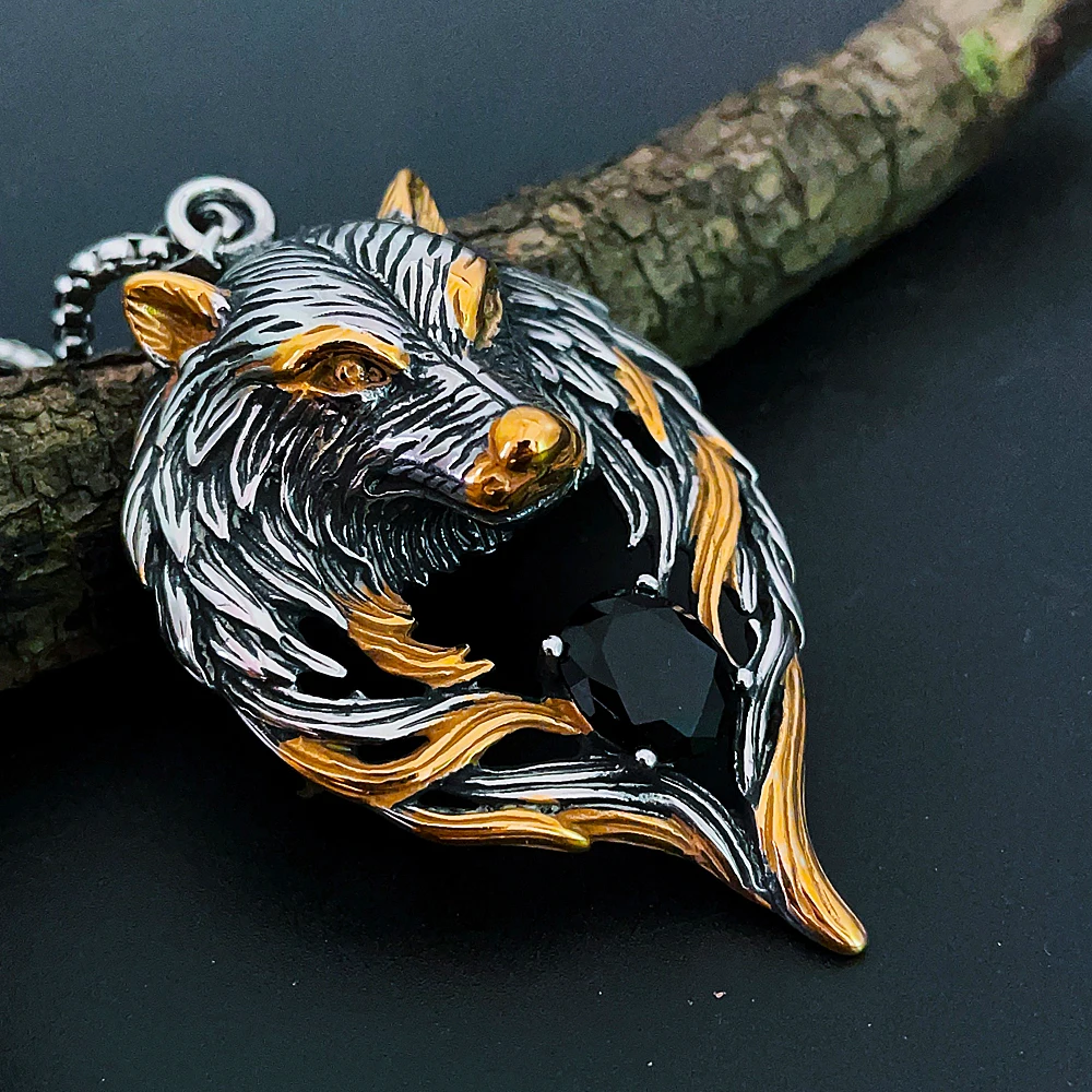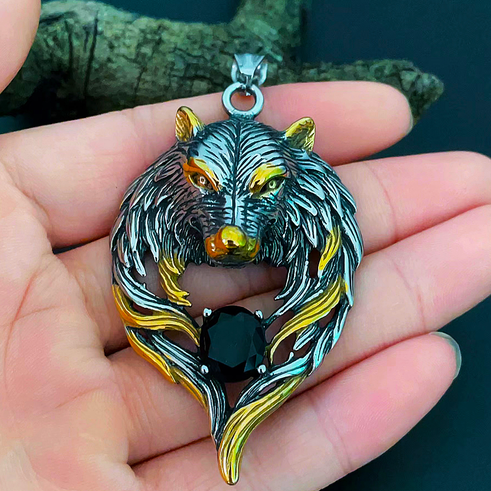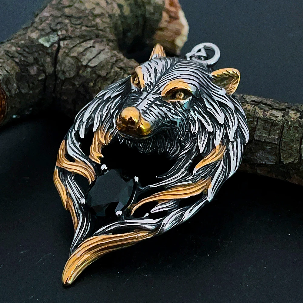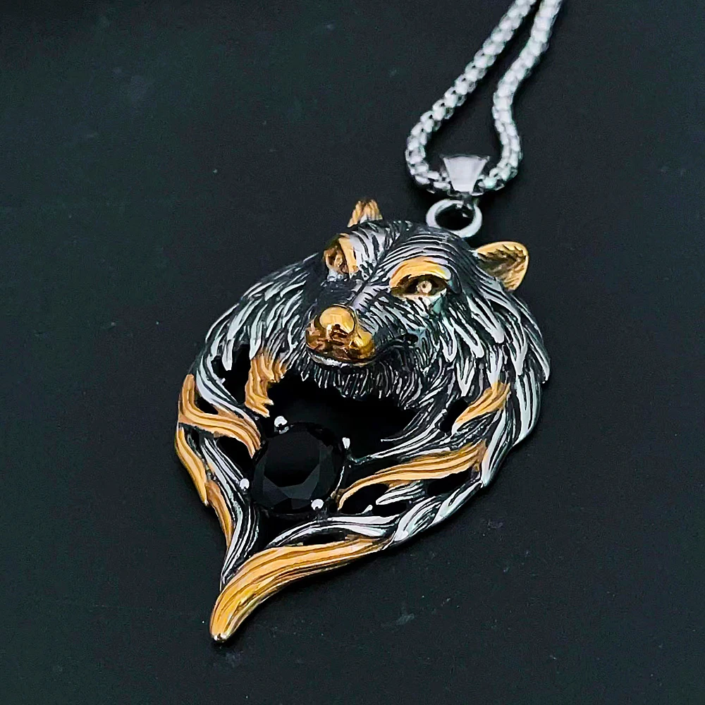 Vintage Wolf Head Stone Viking Pendant Necklace
